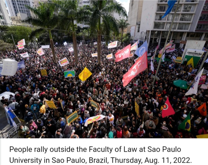 In 1977, the masses poured into the University of Sao Paulo’s law school to listen to a reading of “A Letter to Brazilians,” a manifesto calling for a prompt return of the rule of law. On Thursday, they heard declarations defending democracy and the country’s elections systems, which President JairBolsonaro has repeatedly attacked ahead of his reelection bid.